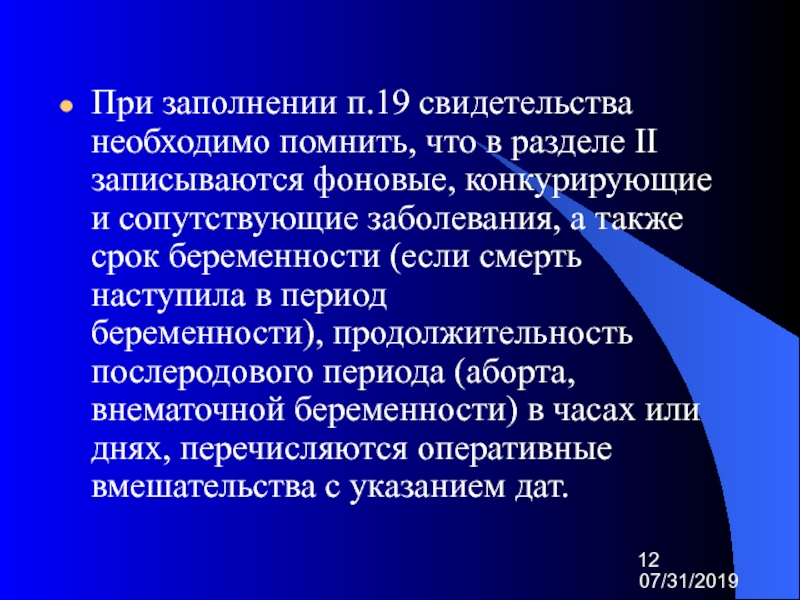 фоновые, конкурирующие и сопутствующие заболевания, а также срок беременности (если смерть наступила в период
