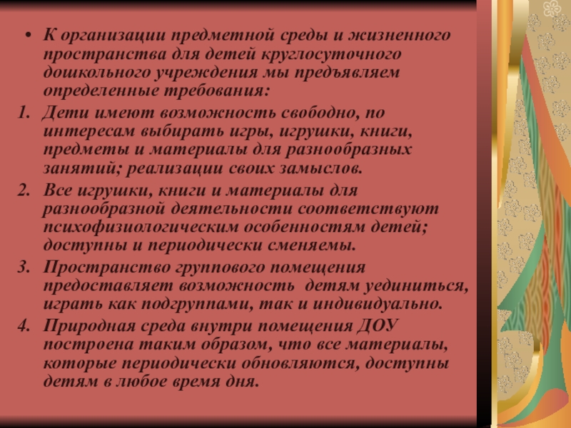 Слайд 6К организации предметной среды и жизненного пространства для детей круглосуточного дошкольного