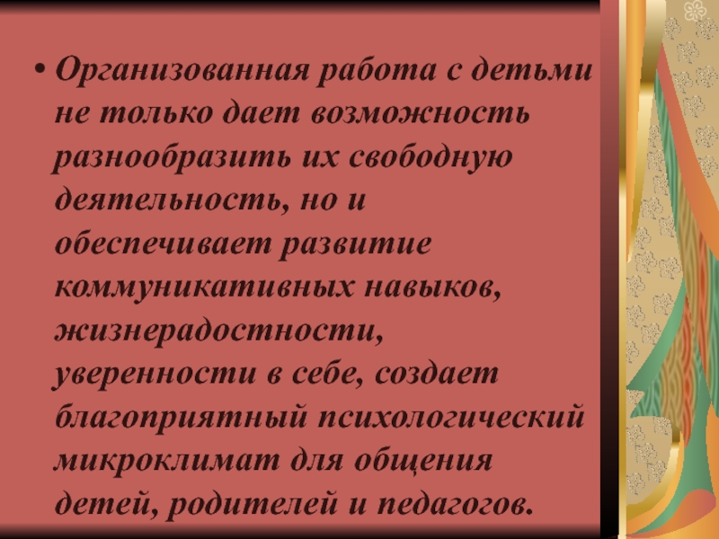 Слайд 19Организованная работа с детьми не только дает возможность разнообразить их свободную