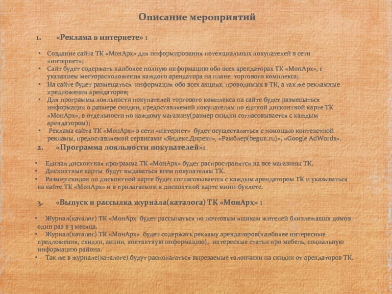 Журнал(каталог) ТК «МонАрх» будет содержать рекламу арендаторов(наиболее интересные предложения, скидки, акции, контактную информацию), интересные статьи про мебель, социальную информацию района.