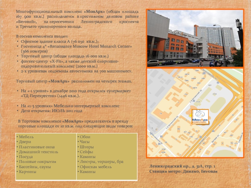В Торговом комплексе «МонАрх» предлагаются в аренду торговые площади от 10 кв.м. под следующие виды товаров: