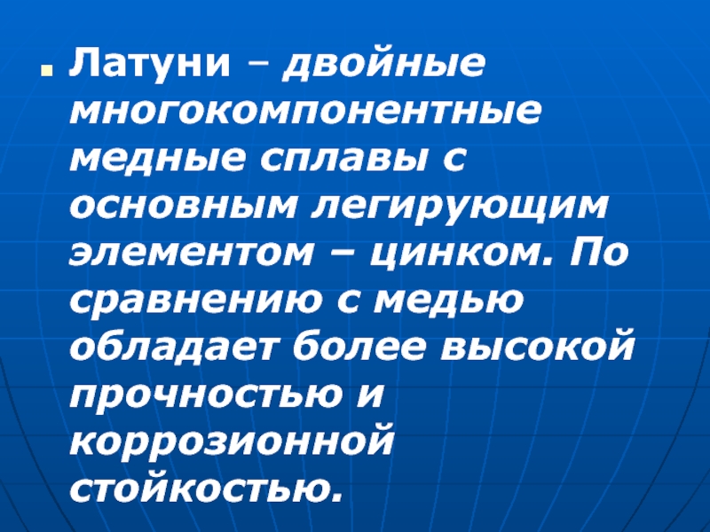 Слайд 5Латуни – двойные многокомпонентные медные сплавы с основным легирующим элементом – цинком.