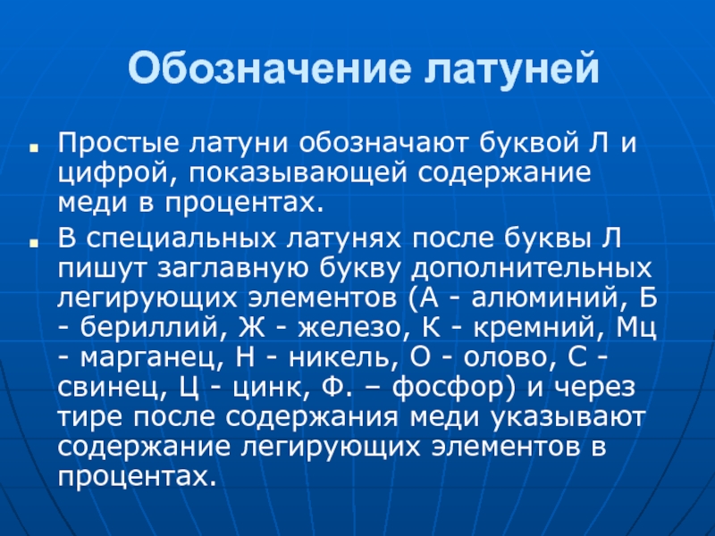 В специальных латунях после буквы Л пишут заглавную букву дополнительных легирующих элементов (А - алюминий, Б - бериллий, Ж - железо, К - кремний, Мц - марганец, Н - никель, О - олово, С - свинец, Ц - цинк, Ф. – фосфор) и через тире после содержания меди указывают содержание легирующих элементов в процентах.