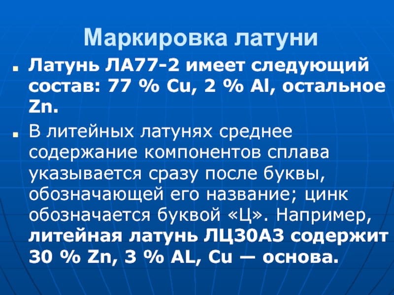 Латунь ЛА77-2 имеет следующий состав: 77 % Cu, 2 %