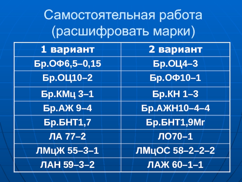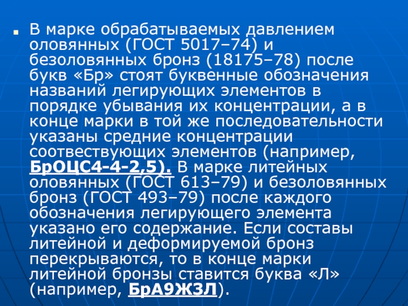 Слайд 11В марке обрабатываемых давлением оловянных (ГОСТ 5017–74) и безоловянных бронз (18175–78)
