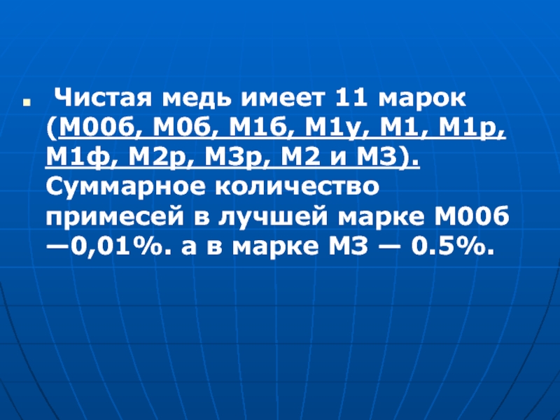 Слайд 4 Чистая медь имеет 11 марок (М00б, М0б, М1б, М1у, М1, М1р,