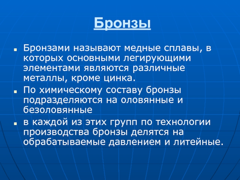 Бронзами называют медные сплавы, в которых основными легирующими элементами являются