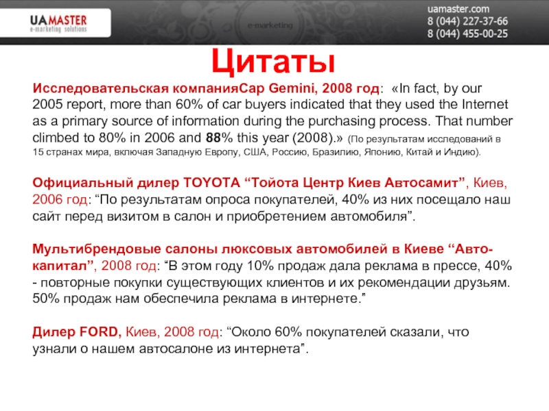 Исследовательская компанияCap Gemini, 2008 год: «In fact, by our 2005 report, more than 60% of car buyers indicated that they used the Internet as a primary source of information during the purchasing process. That number climbed to 80% in 2006 and 88% this year (2008).» (По результатам исследований в 15 странах мира, включая Западную Европу, США, Россию, Бразилию, Японию, Китай и Индию).