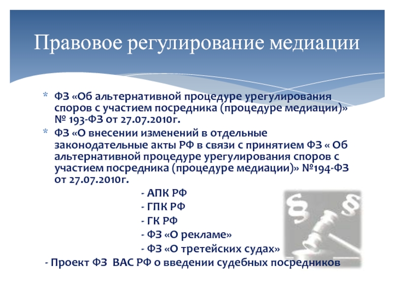Примирительные процедуры широко известны в странах с развитой рыночной экономикой и доказали свою эффективность. В ряде стран более 80 % споров не доходят до судов и регулируются с помощью посредников (медиаторов)