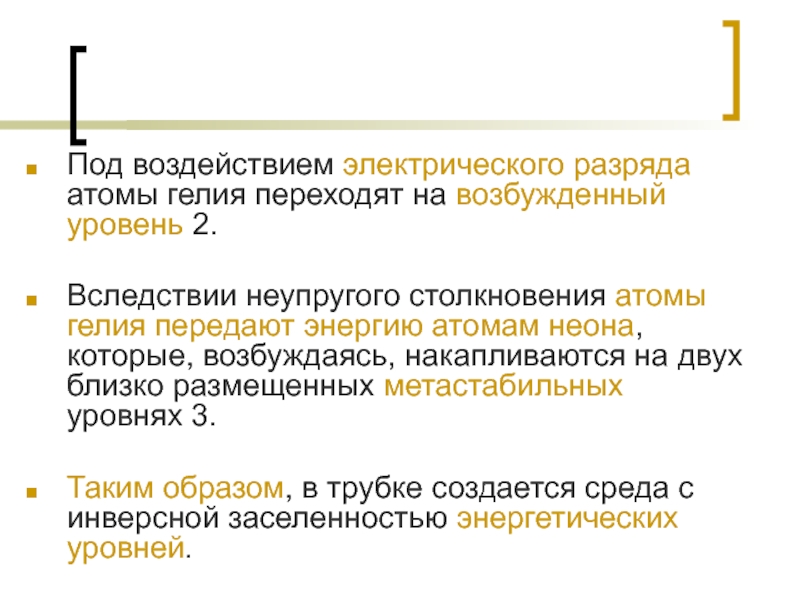Вследствии неупругого столкновения атомы гелия передают энергию атомам неона, которые, возбуждаясь, накапливаются на двух близко размещенных метастабильных уровнях 3.