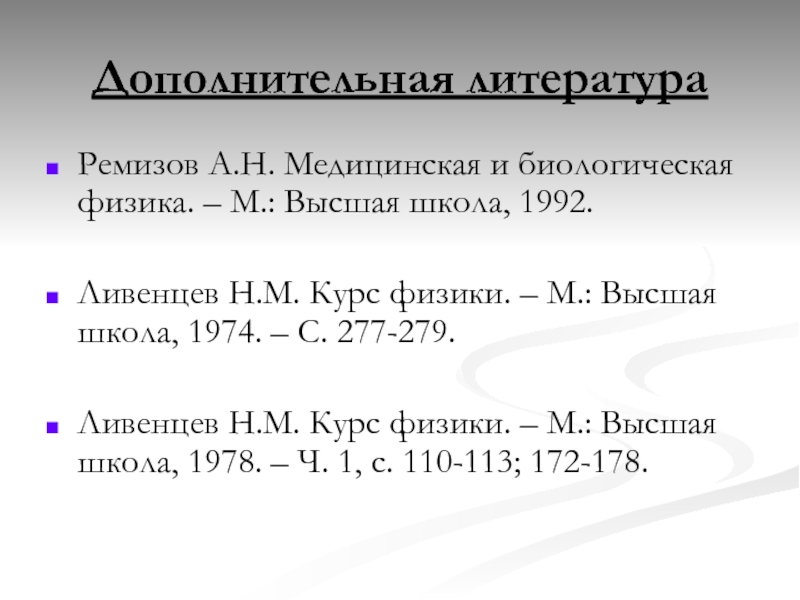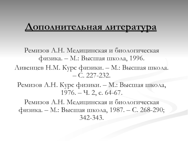 Ремизов А.Н. Медицинская и биологическая физика. – М.: Высшая школа, 1987. – С. 268-290; 342-343.