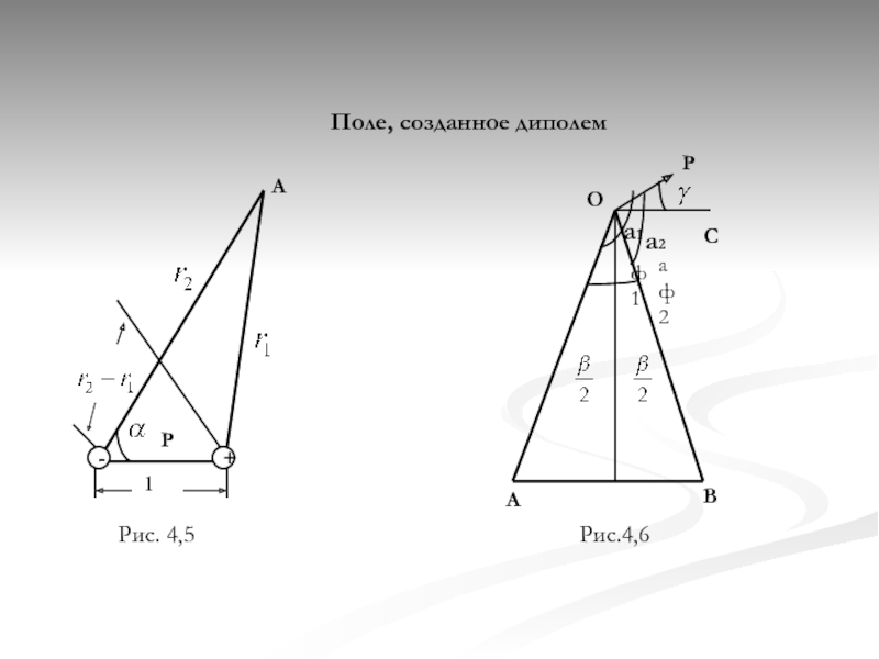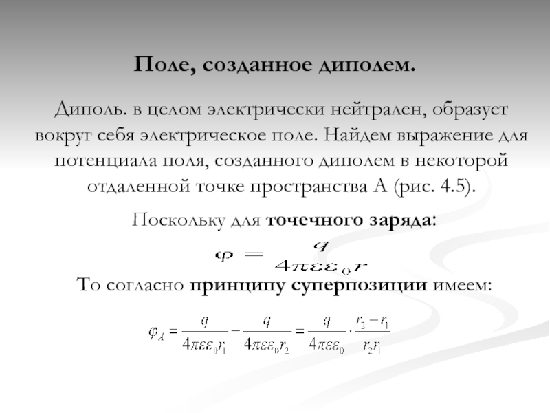 поле. Найдем выражение для потенциала поля, созданного диполем в некоторой отдаленной точке пространства А (рис. 4.5).