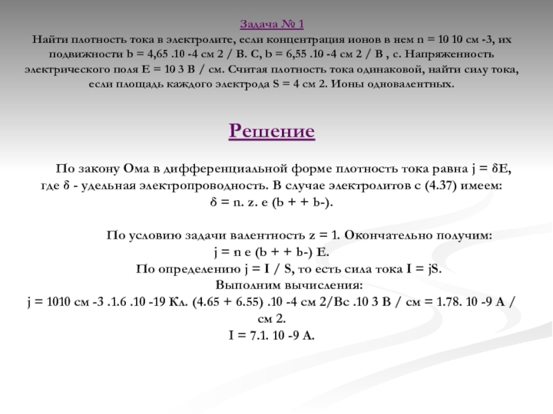 наших целей) приближении можно считать, что на ион в электролите действуют две силы: сила электрического поля F = q, где q – заряд иона, Е – напряженность электрического поля, и сила сопротивления Fm електроліта. Сила Fm обусловлена действием молекул, которые окружают ион; это действие приводит к тому, что ион, подобно к шарику в вяжущей среде, при своем движении одолевает сопротивление, величина которого пропорциональная скорости v: