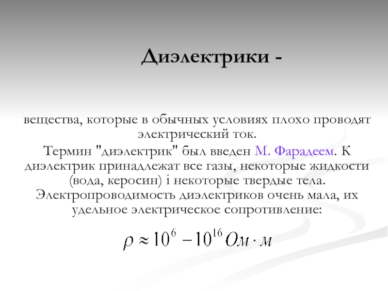 "диэлектрик" был введен М. Фарадеем. К диэлектрик принадлежат все газы, некоторые жидкости (вода, керосин) i некоторые твердые тела. Электропроводимость диэлектриков очень мала, их удельное электрическое сопротивление:
