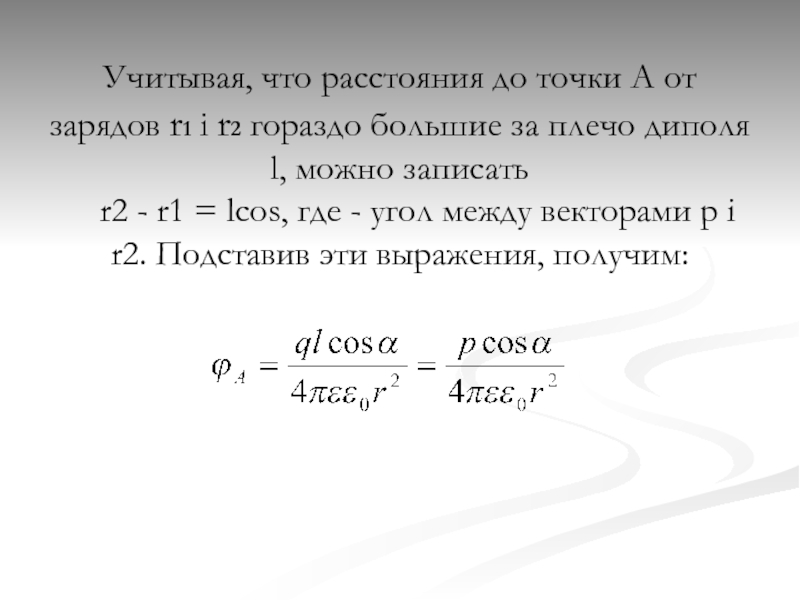 Слайд 13Учитывая, что расстояния до точки А от зарядов r1 i r2