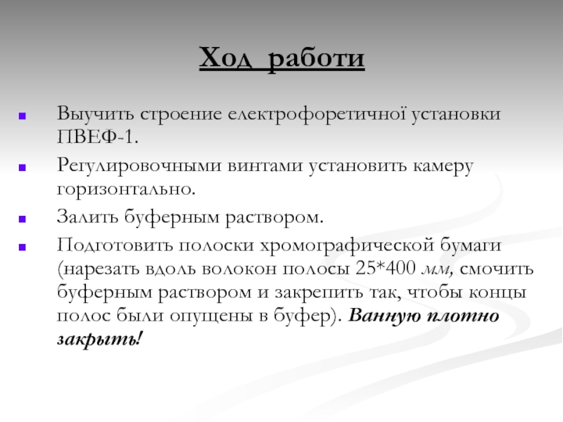 Подготовить полоски хромографической бумаги (нарезать вдоль волокон полосы 25*400 мм, смочить буферным раствором и закрепить так, чтобы концы полос были опущены в буфер). Ванную плотно закрыть!
