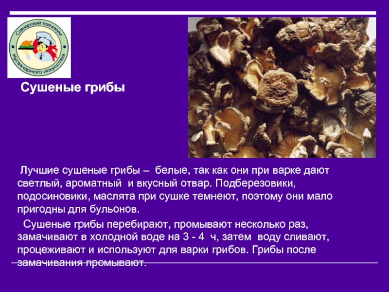 варке дают светлый, ароматный и вкусный отвар. Подберезовики, подосиновики, маслята при сушке темнеют, поэтому они мало пригодны для бульонов.