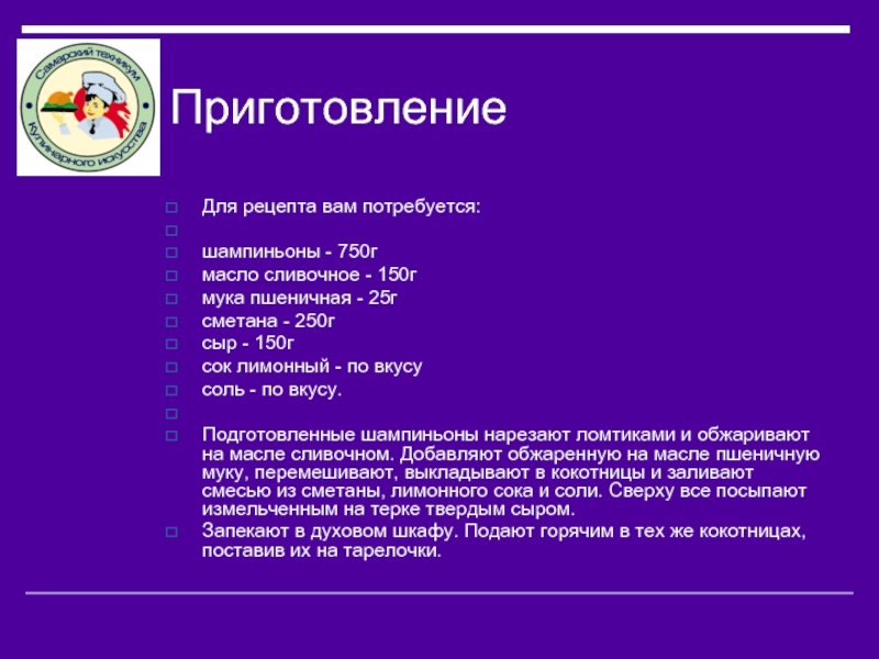 Подготовленные шампиньоны нарезают ломтиками и обжаривают на масле сливочном. Добавляют обжаренную на масле пшеничную муку, перемешивают, выкладывают в кокотницы и заливают смесью из сметаны, лимонного сока и соли. Сверху все посыпают измельченным на терке твердым сыром.