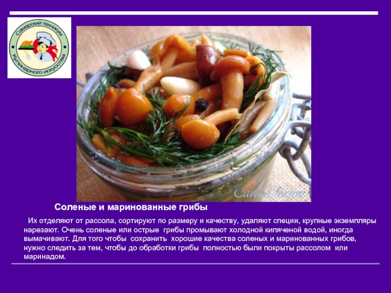 размеру и качеству, удаляют специи, крупные экземпляры нарезают. Очень соленые или острые грибы промывают холодной кипяченой водой, иногда вымачивают. Для того чтобы сохранить хорошие качества соленых и маринованных грибов, нужно следить за тем, чтобы до обработки грибы полностью были покрыты рассолом или маринадом.