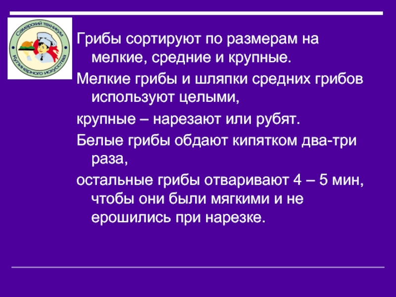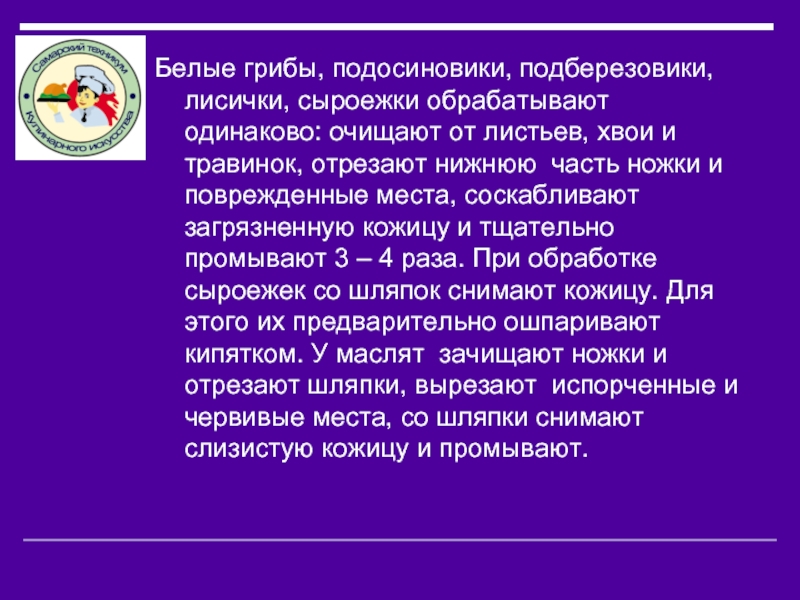 хвои и травинок, отрезают нижнюю часть ножки и поврежденные места, соскабливают загрязненную кожицу и тщательно промывают 3 – 4 раза. При обработке сыроежек со шляпок снимают кожицу. Для этого их предварительно ошпаривают кипятком. У маслят зачищают ножки и отрезают шляпки, вырезают испорченные и червивые места, со шляпки снимают слизистую кожицу и промывают.