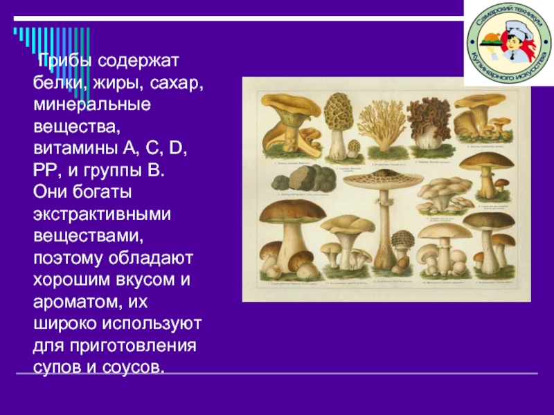 Слайд 2 Грибы содержат белки, жиры, сахар, минеральные вещества, витамины А, С,