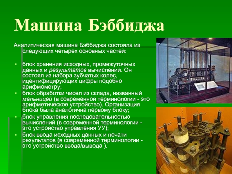 Аналитическая машина Бэббиджа состояла из следующих четырех основных частей:
