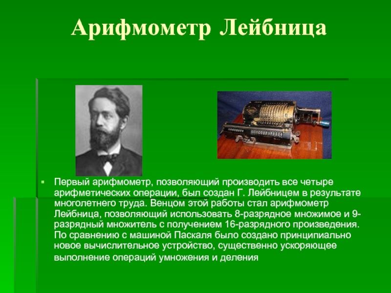Г. Лейбницем в результате многолетнего труда. Венцом этой работы стал арифмометр Лейбница, позволяющий использовать 8-разрядное множимое и 9-разрядный множитель с получением 16-разрядного произведения. По сравнению с машиной Паскаля было создано принципиально новое вычислительное устройство, существенно ускоряющее выполнение операций умножения и деления