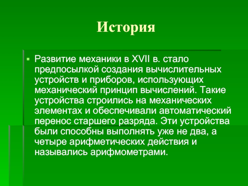 приборов, использующих механический принцип вычислений. Такие устройства строились на механических элементах и обеспечивали автоматический перенос старшего разряда. Эти устройства были способны выполнять уже не два, а четыре арифметических действия и назывались арифмометрами.