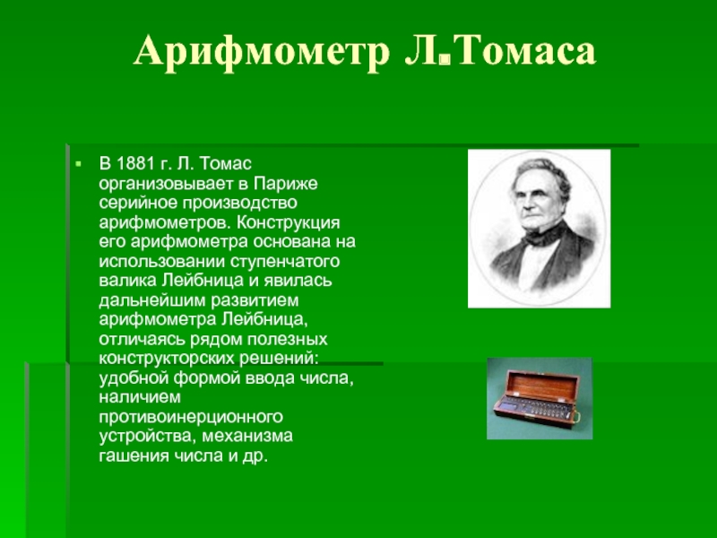 арифмометров. Конструкция его арифмометра основана на использовании ступенчатого валика Лейбница и явилась дальнейшим развитием арифмометра Лейбница, отличаясь рядом полезных конструкторских решений: удобной формой ввода числа, наличием противоинерционного устройства, механизма гашения числа и др.
