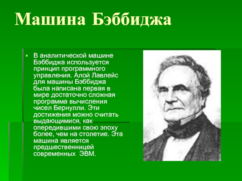 для машины Бэббиджа была написана первая в мире достаточно сложная программа вычисления чисел Бернулли. Эти достижения можно считать выдающимися, как опередившими свою эпоху более, чем на столетие. Эта машина является предшественницей современных ЭВМ.