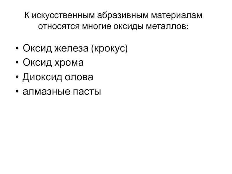 Слайд 12К искусственным абразивным материалам относятся многие оксиды металлов: