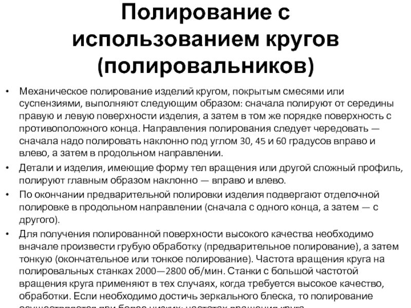Для получения полированной поверхности высокого качества необходимо вначале произвести грубую обработку (предварительное полирование), а затем тонкую (окончательное или тонкое полирование). Частота вращения круга на полировальных станках 2000—2800 об/мин. Станки с большой частотой вращения круга применяют в тех случаях, когда требуется высокое качество, обработки. Если необходимо достичь зеркального блеска, то полирование осуществляется при более низких: частотах вращения круга.