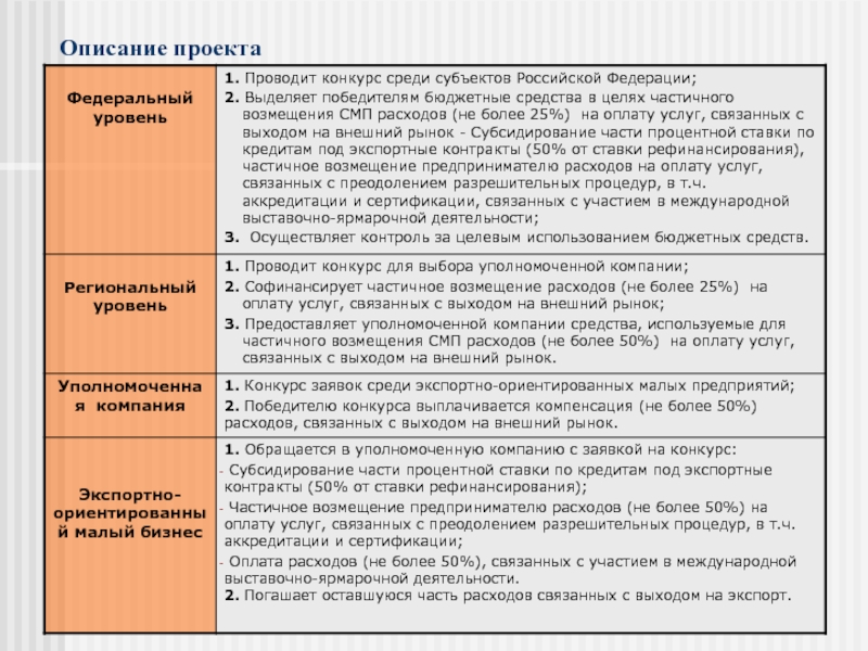 1. Проведение открытых конкурсов при отборе проектов, претендующих на поддержку. Раскрытие информации об учредителях предприятий. Непременным условием должно быть наличие у малого предприятия экспортного контракта. Наличие у коммерческого банка лицензии на право осуществления экспортных операций;