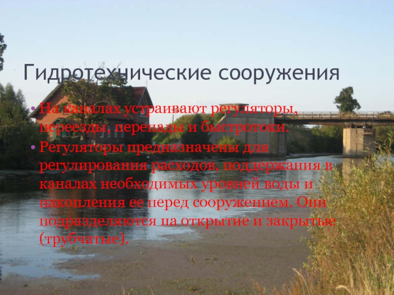 На каналах устраивают регуляторы, переезды, перепады и быстротоки.
