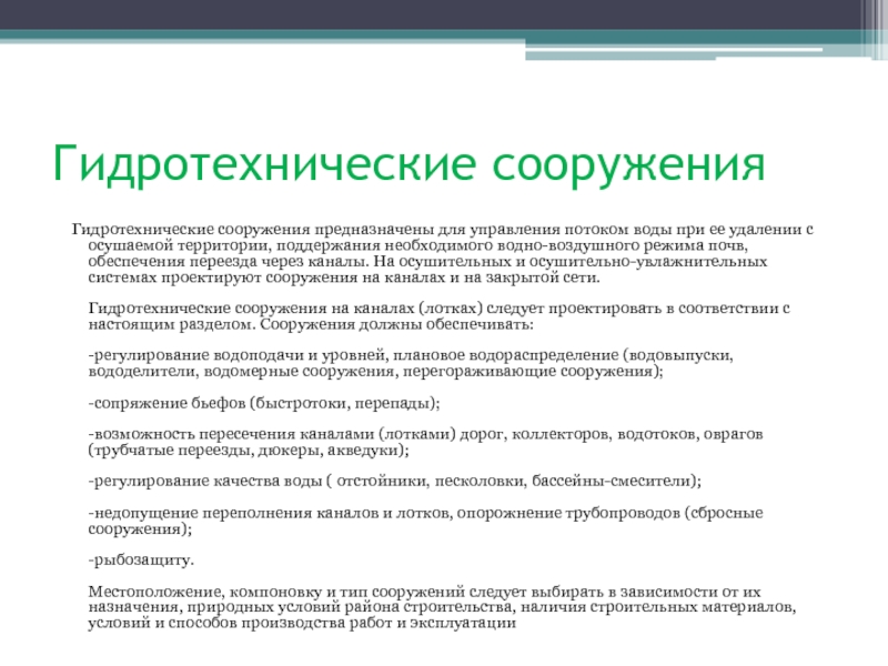 удалении с осушаемой территории, поддержания необходимого водно-воздушного режима почв, обеспечения переезда через каналы. На осушительных и осушительно-увлажнительных системах проектируют сооружения на каналах и на закрытой сети.