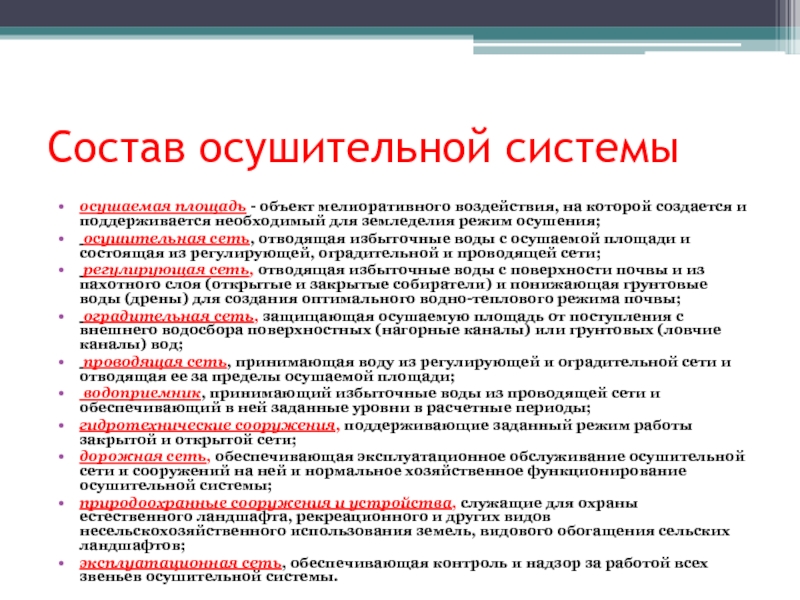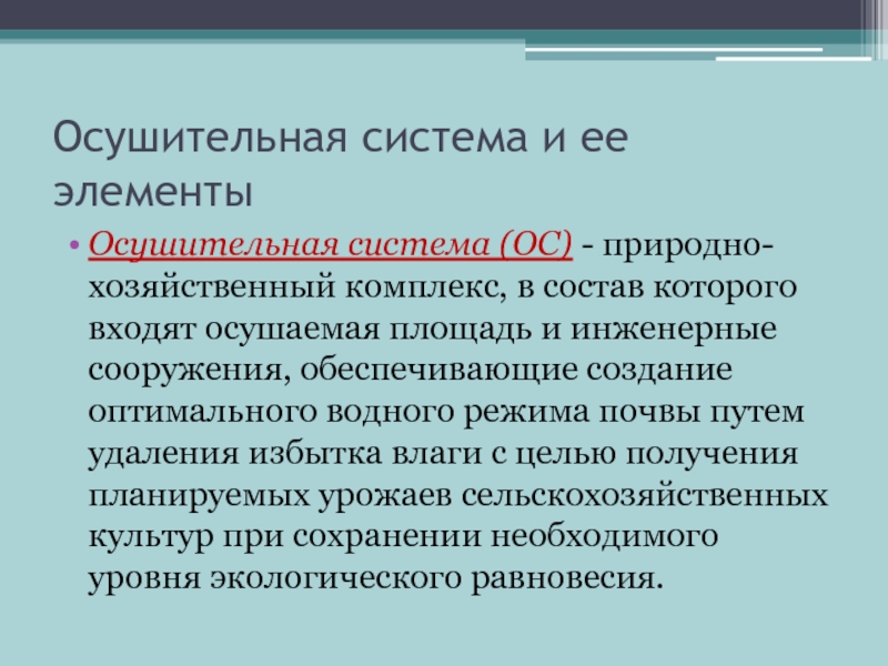 состав которого входят осушаемая площадь и инженерные сооружения, обеспечивающие создание оптимального водного режима почвы путем удаления избытка влаги с целью получения планируемых урожаев сельскохозяйственных культур при сохранении необходимого уровня экологического равновесия.