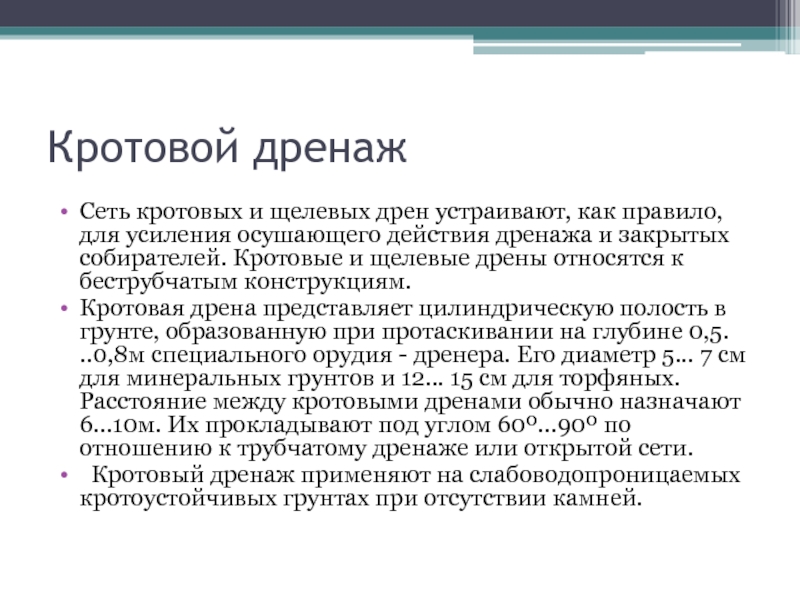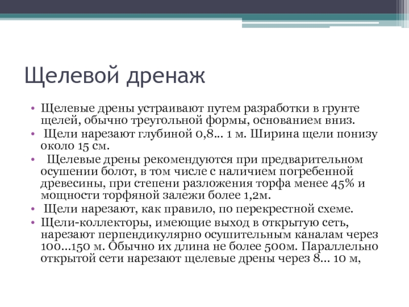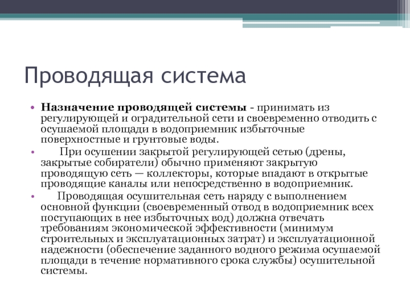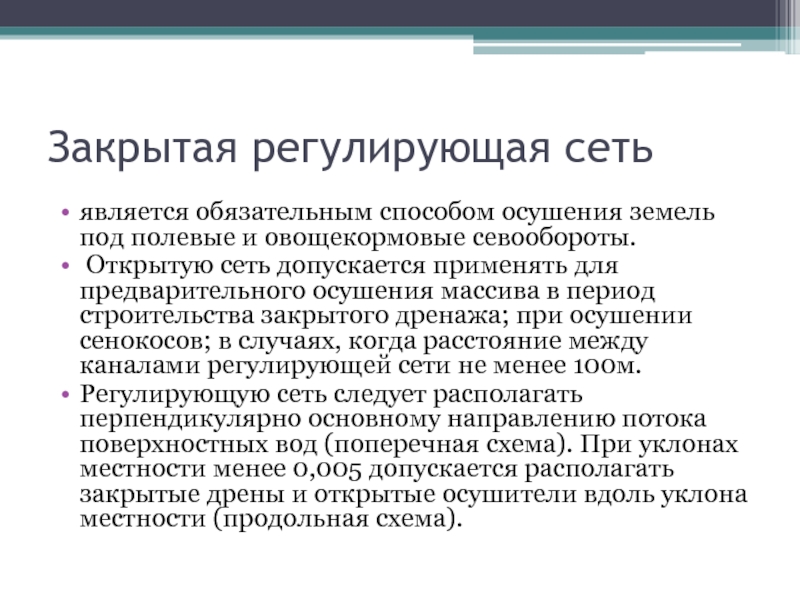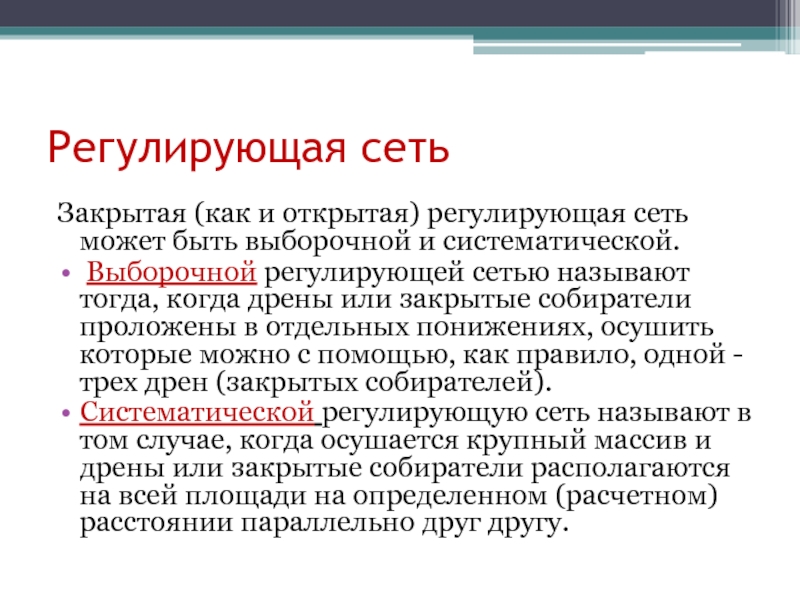Систематической регулирующую сеть называют в том случае, когда осушается крупный массив и дрены или закрытые собиратели располагаются на всей площади на определенном (расчетном) расстоянии параллельно друг другу.
