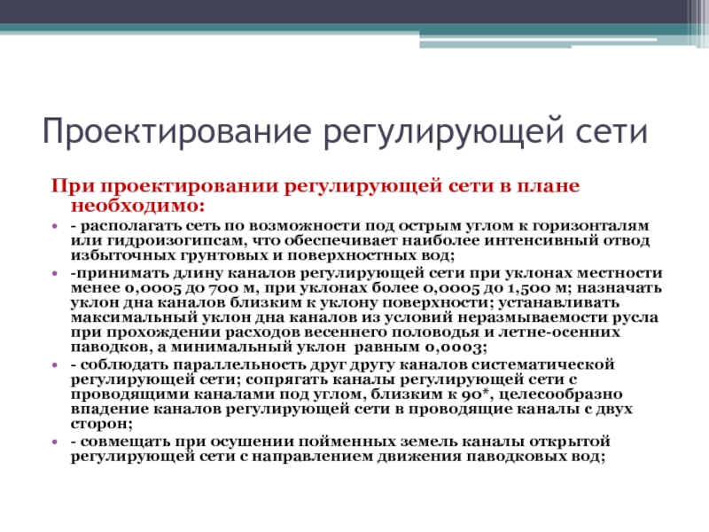 - соблюдать параллельность друг другу каналов систематической регулирующей сети; сопрягать каналы регулирующей сети с проводящими каналами под углом, близким к 90*, целесообразно впадение каналов регулирующей сети в проводящие каналы с двух сторон;