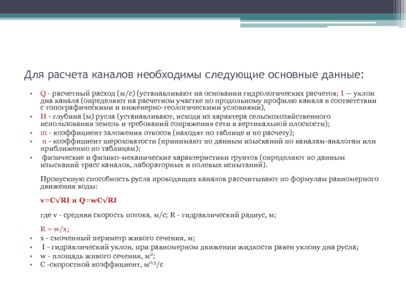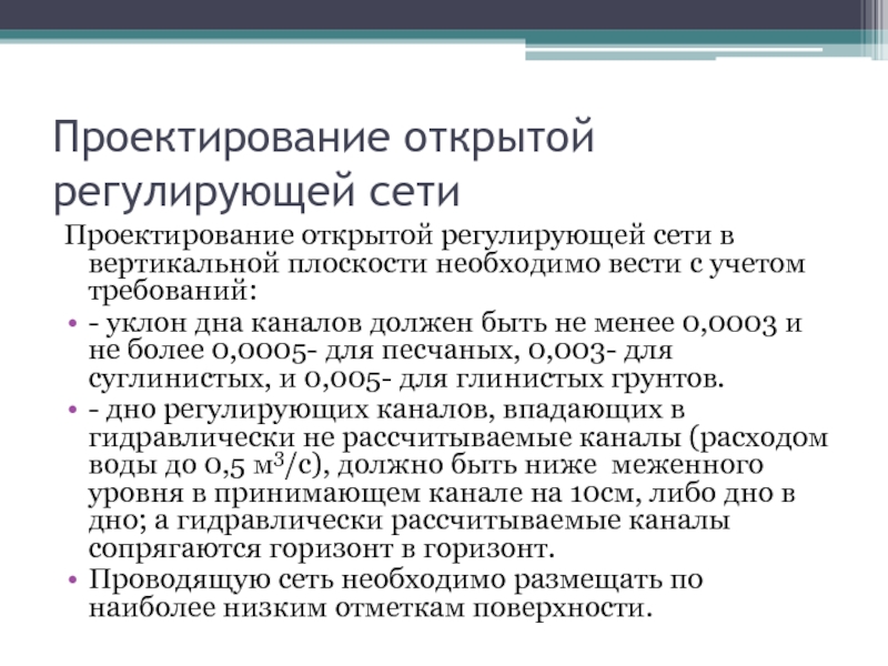 -принимать длину каналов регулирующей сети при уклонах местности менее 0,0005 до 700 м, при уклонах более 0,0005 до 1,500 м; назначать уклон дна каналов близким к уклону поверхности; устанавливать максимальный уклон дна каналов из условий неразмываемости русла при прохождении расходов весеннего половодья и летне-осенних паводков, а минимальный уклон равным 0,0003;