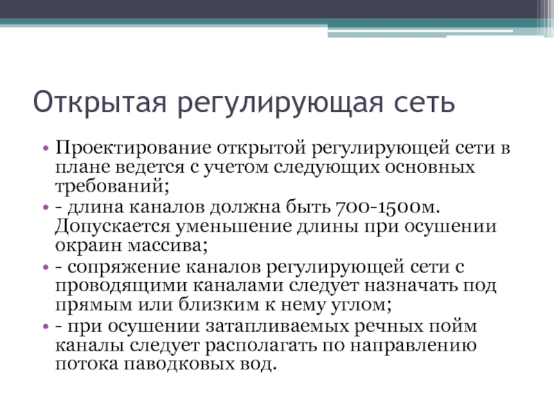 Слайд 14Регулирующая сеть должна обеспечивать отвод поверхностных вод и понижение уровня подземных