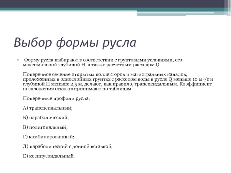 Форму русла выбирают в соответствии с грунтовыми условиями, его