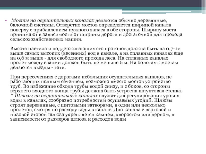 Слайд 46 Мосты на осушительных каналах делаются обычно деревянные, балочной системы. Отверстие мостов определяется