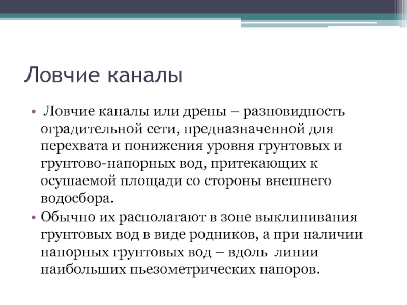 оградительная сеть, защищающая осушаемую площадь от поступления с внешнего водосбора поверхностных (нагорные каналы) или грунтовых (ловчие каналы) вод;