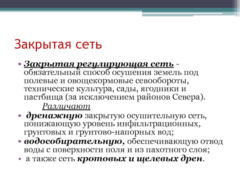 регулирующая сеть, отводящая избыточные воды с поверхности почвы и из пахотного слоя (открытые и закрытые собиратели) и понижающая грунтовые воды (дрены) для создания оптимального водно-теплового режима почвы;