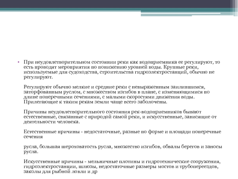 При неудовлетворительном состоянии реки как водоприемника ее регулируют, то есть проводят