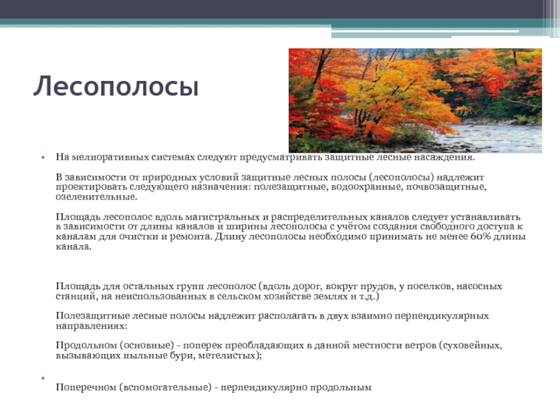 природных условий защитные лесных полосы (лесополосы) надлежит проектировать следующего назначения: полезащитные, водоохранные, почвозащитные, озеленительные.