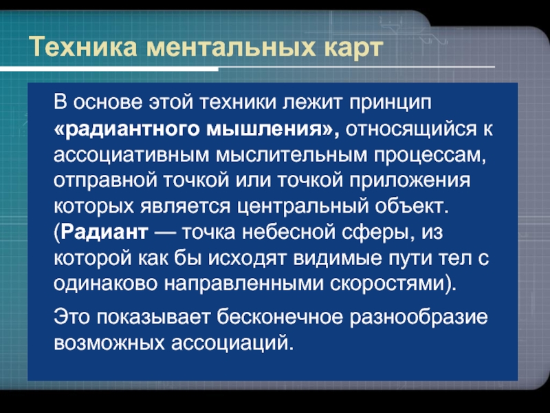 к ассоциативным мыслительным процессам, отправной точкой или точкой приложения которых является центральный объект. (Радиант — точка небесной сферы, из которой как бы исходят видимые пути тел с одинаково направленными скоростями).
