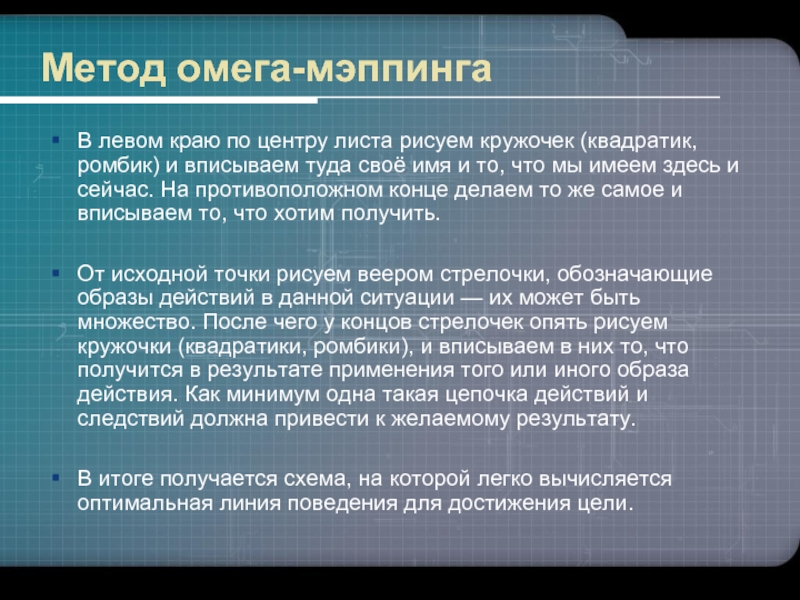 От исходной точки рисуем веером стрелочки, обозначающие образы действий в данной ситуации — их может быть множество. После чего у концов стрелочек опять рисуем кружочки (квадратики, ромбики), и вписываем в них то, что получится в результате применения того или иного образа действия. Как минимум одна такая цепочка действий и следствий должна привести к желаемому результату.