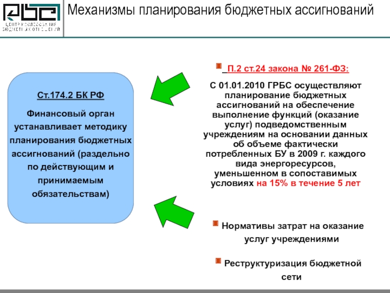 С 01.01.2010 ГРБС осуществляют планирование бюджетных ассигнований на обеспечение выполнение функций (оказание услуг) подведомственным учреждениям на основании данных об объеме фактически потребленных БУ в 2009 г. каждого вида энергоресурсов, уменьшенном в сопоставимых условиях на 15% в течение 5 лет