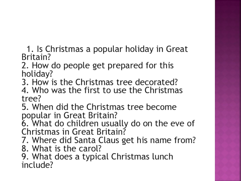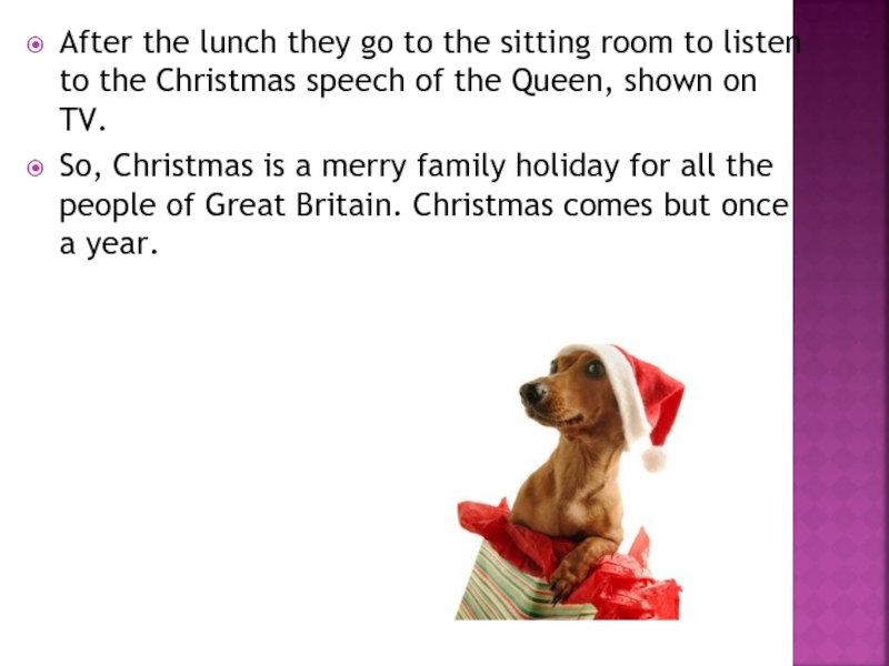 in Great Britain. It is a family holiday. Traditionally all relatives and friends give each other presents. So, before Christmas all the department stores and shops are crowded, everybody is choosing a present